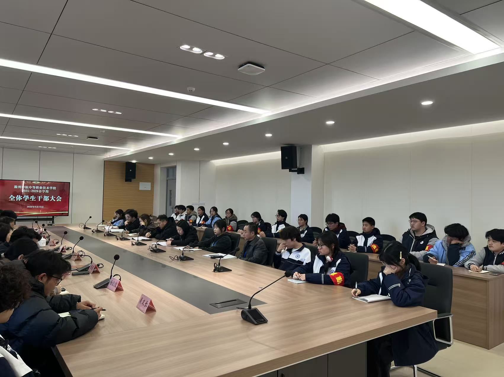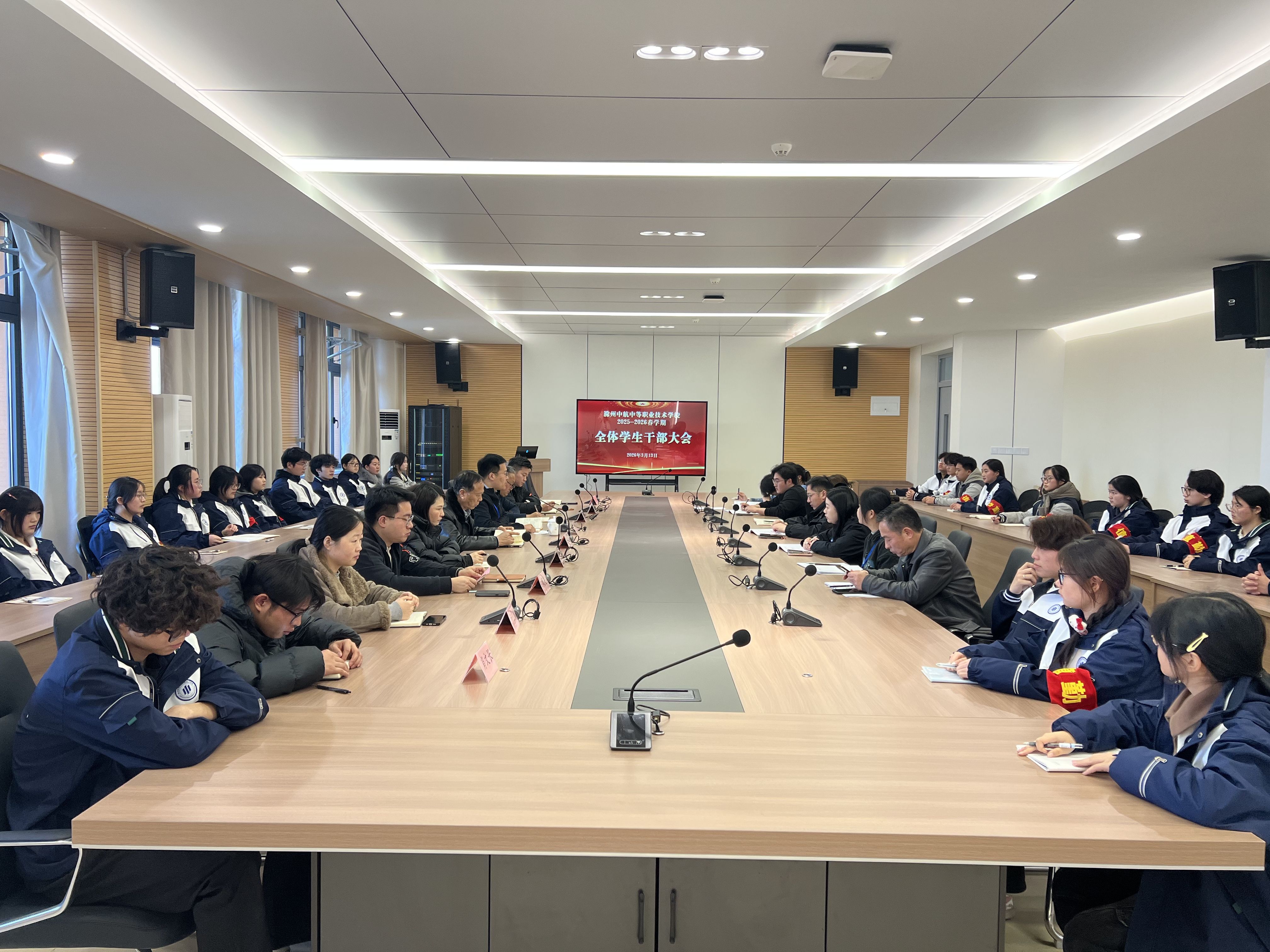 为总结上学期学生工作成效,部署新学期重点工作任务,促进学生干部砥砺奋进,推动校园学生工作高质量开展,近日,学生处在教学楼二楼会议室召开2025—2026学年第二学期初全体学生干部会议。学校党支部书记、常务副校长开俊林,校办公室主任兼工会副主席王莹,纪检组长、团委书记、学生处处长张硕,各科室负责人,全体班主任出席会议,各班级班团干部、校学生会全体学生干部参加会议。会议由学生处钱亮科长主持。